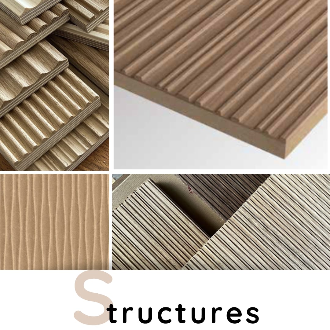 •Des panneaux muraux texturés (cannelures, stries, effets martelés, rainures, reliefs sculptés...)